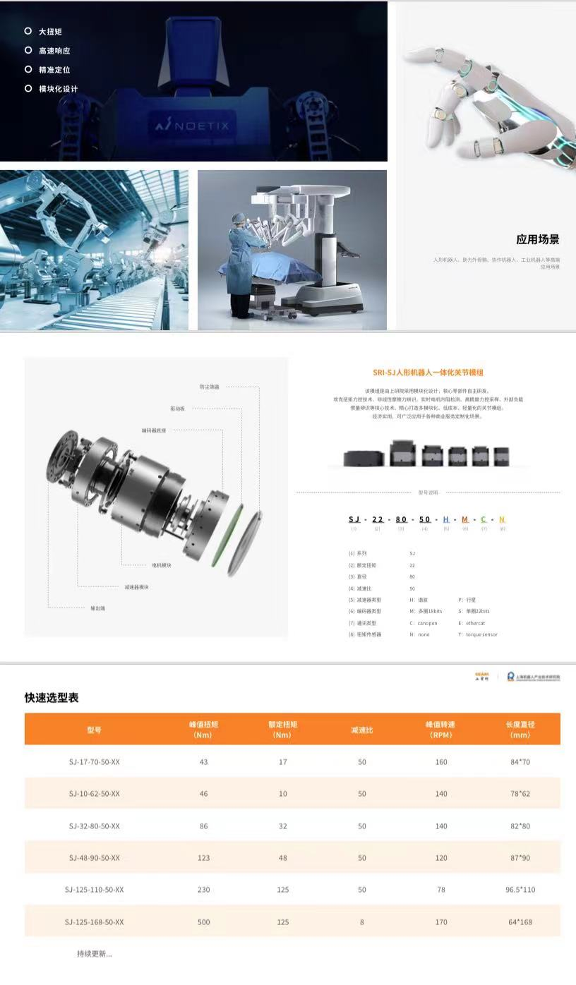 关节模组是高度集成设计的一体化模块式关节,即是机器人关节部分的核心模块,能快速实现机器人各类应用及功能需求。利用关节模组进行组装机器人,能省去上百种机械电子器件的选型、设计、采购及组装,大大降低机器人研发时间和人力成本。