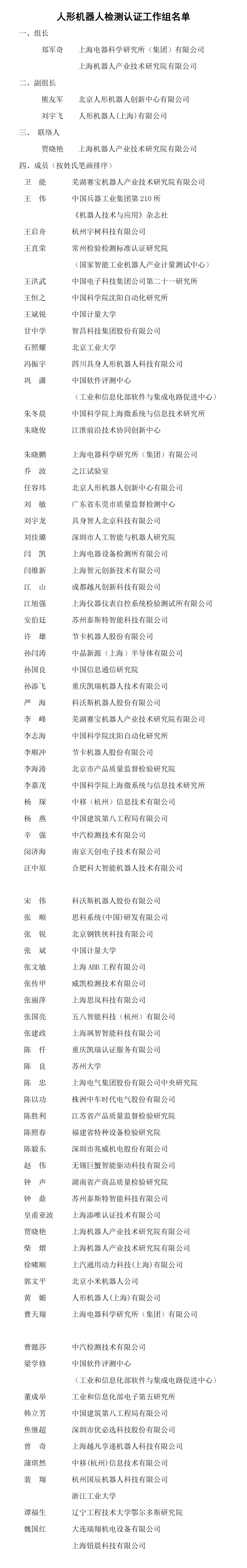 人形机器人检测认证工作组名单