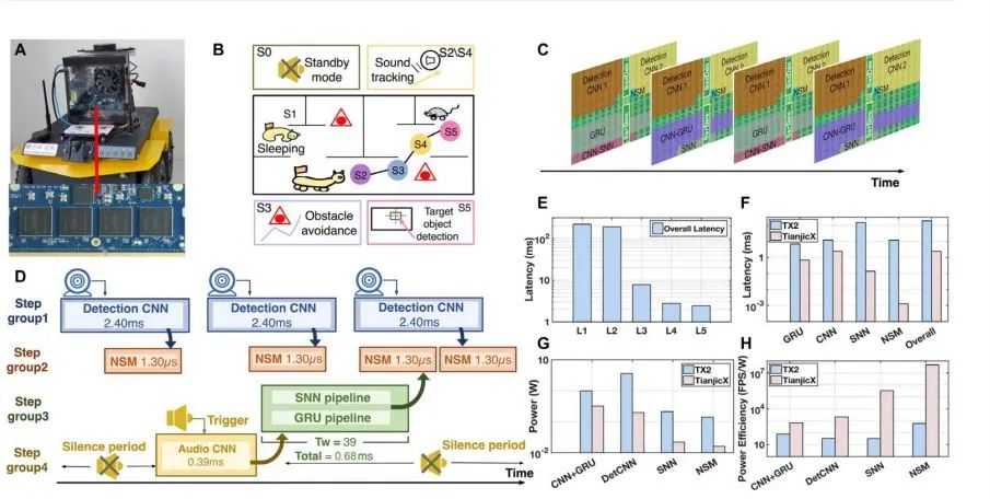为了展示TianjicX的能力,研究人员将4个TianjicX阵列部署在了多智能任务移动机器人中,并配备了多模态传感器,每个芯片可以单独激活,而在猫捉老鼠的实验中,天机猫仅激活了一个TianjicX。