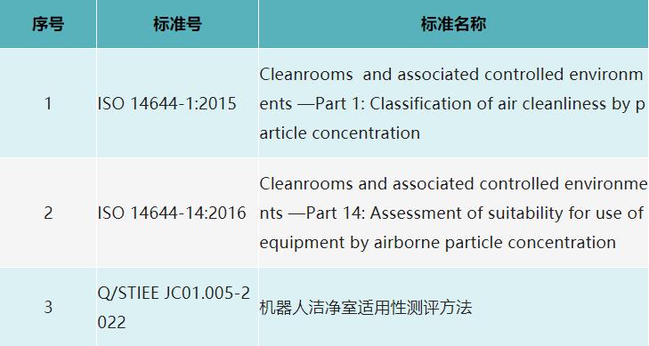 SO 14644-1:2015、ISO 14644-14:2016为国际标准,其中ISO 14644-1:2015根据空气中悬浮粒子浓度来划分洁净室及相关受控环境中空气洁净度的等级,ISO 14644-14:2016针对洁净室适用性测评的通用标准,两份国家标准提供了等级划分依据、通用测评程序等基础共性要求,Q/STIEE JC01.005-2022是国家机器人检测与评定中心(总部)在机器人洁净度测评领域多年的检测认证实践所形成的技术成果,作为上海电器设备检测所有限公司(STIEE)企业标准,是行业内首个专门针对机器人的洁净度测评标准。