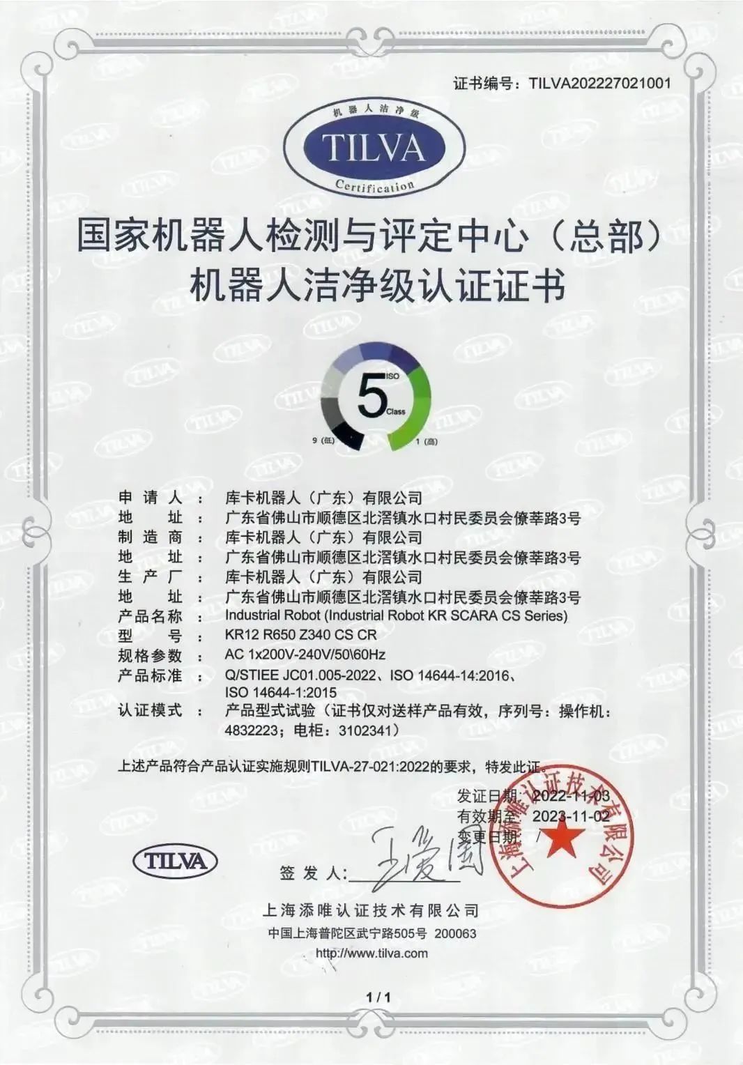 TILVA首推机器人洁净级认证,KUKA 2022新品获证