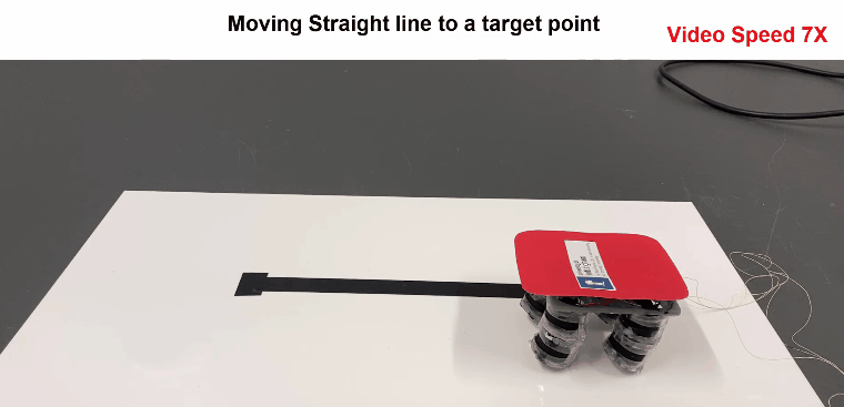 因此,研究人员将这种驱动器组装成软体机器人,通过控制驱动器(机器人腿)的电压时序信号,控制机器人分别实现的循迹前进(速度为2.1mm/s)和转弯运动: